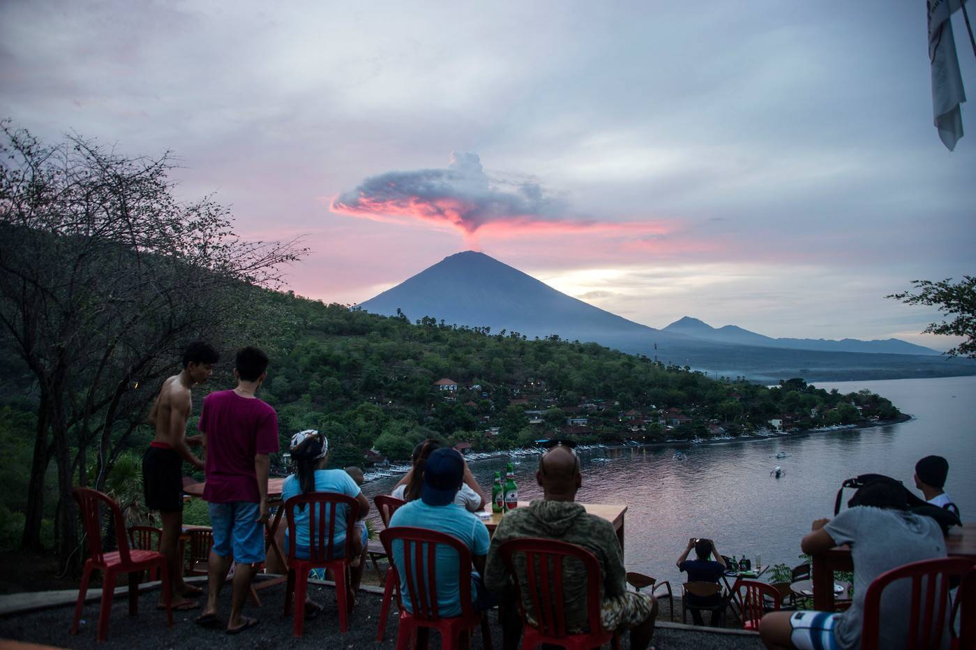 В ноябре 2017 года в этом районе произошло 844 вулканических землетрясения, пиковое значение которых составило от 300 до 400 землетрясений 26 сентября. Частота и интенсивность этих землетрясений вызвали большую тревогу среди сейсмологов, поскольку исторически известно, что подобные вулканы извергались с еще меньшим количеством предупреждающих знаков. Уровень опасности был повышен до максимального, и около 122 500 человек были эвакуированы из своих домов вокруг вулкана. Национальный Disaster Management Authority индонезийского объявил 12-километровую зону отчуждения вокруг вулкана на 24 сентябре. Эвакуированные собрались в спортивных залах и других общественных зданиях вокруг Клунгкунга , Карангасема , Булеленга и других районов. К концу октября 2017 года активность вулкана значительно снизилась, что привело к понижению статуса высшей чрезвычайной ситуации 29 октября.