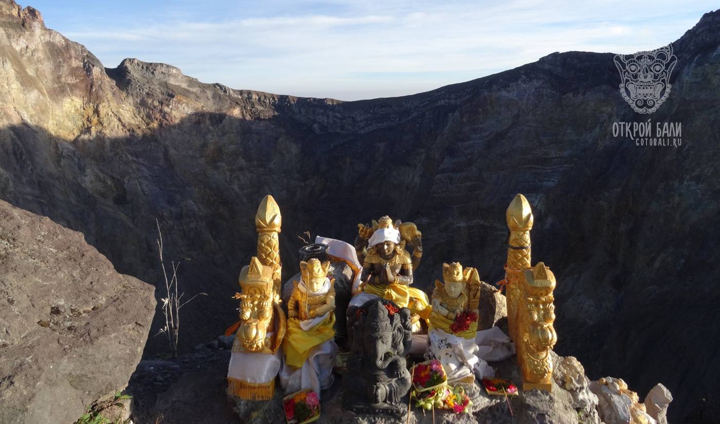 Вход в мир небожителей не закрыт и для простых смертных. Для этого нужно бытьпорядочным человеком и тогда все его поступки будут по достоинству оценены богами. После смерти за его душой боги отправляют птицу Гаруду, которая доставляет её в лучший мир. Поэтому кратер вулкана воспринимается большинством балийцев как место пребывания духов предков: в каждом доме любого селения алтарь домашнего храма обращен в сторону священной горы.