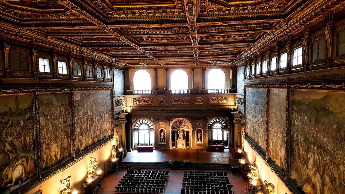 Палаццо Веккьо является проектом Арнольфо ди Камбио, который кстати также отвечал за строительство Дуомо. После переселения во дворец семейства Медичи, Козимо Первый сделал заказ Джорджо Вазари на реконструкцию залов палаццо. Переделка коснулась и знаменитого Зала Пятисот, над фресками которого работали Микеланджело и Да Винчи, но к сожалению ни один, ни другой так их и не закончили.