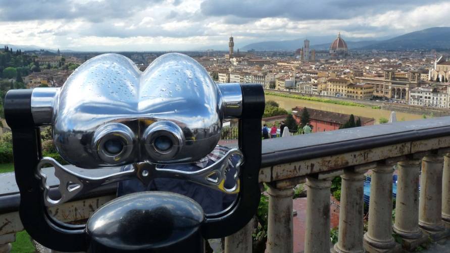 С высокого холма видно, как уютно расположилась между холмов Флоренция, сверкая красными черепицами крыш. С этой точки можно разглядеть главные флорентийские достопримечательности: