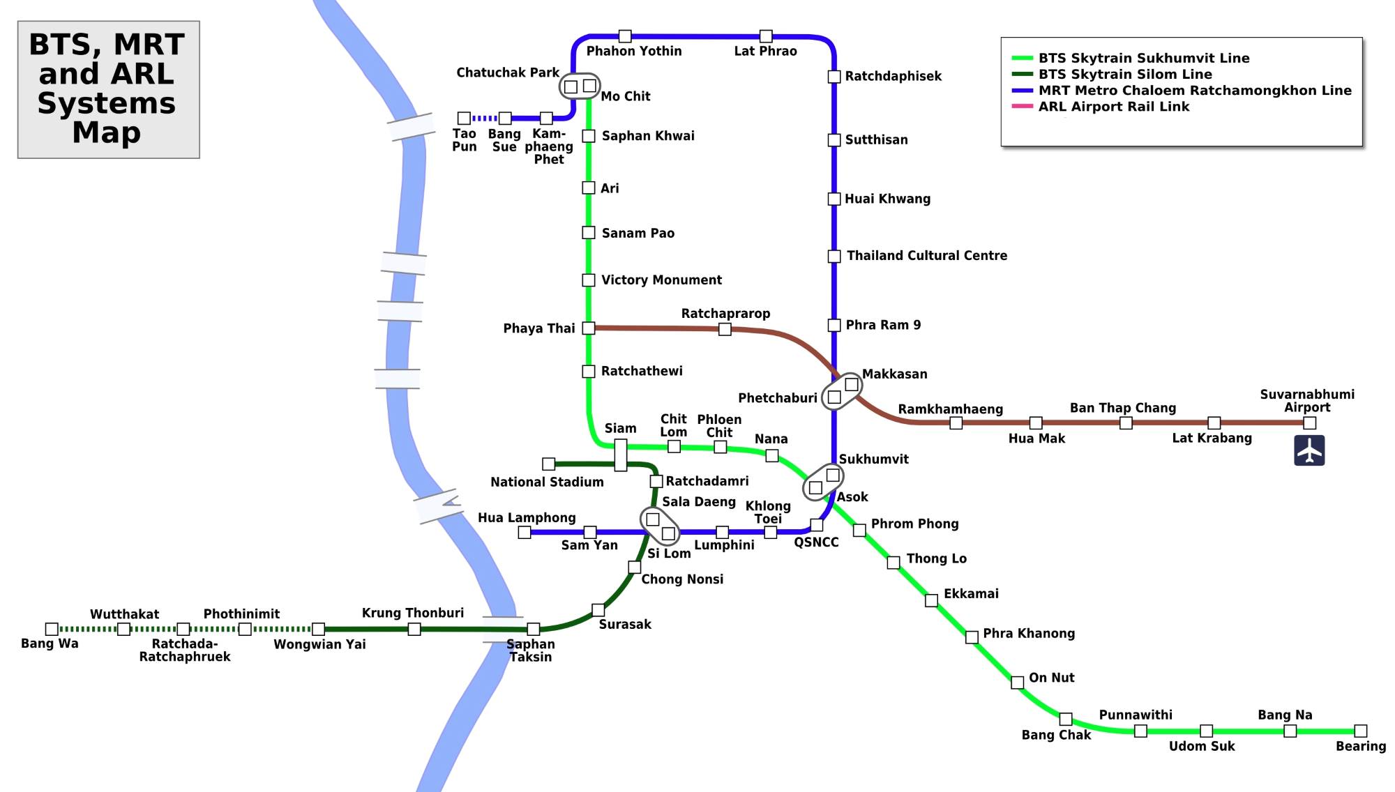 Удобно то, что обе конечные станции MRT – южная Hua lamphong и северная Bang Sue – находятся поблизости от главных железнодорожных станций Бангкока. Со станции Lat Pharo выходят на терминал старого аэропорта Бангкока Дон Мыанг, откуда отправляется большинство внутренних авиационных рейсов страны.