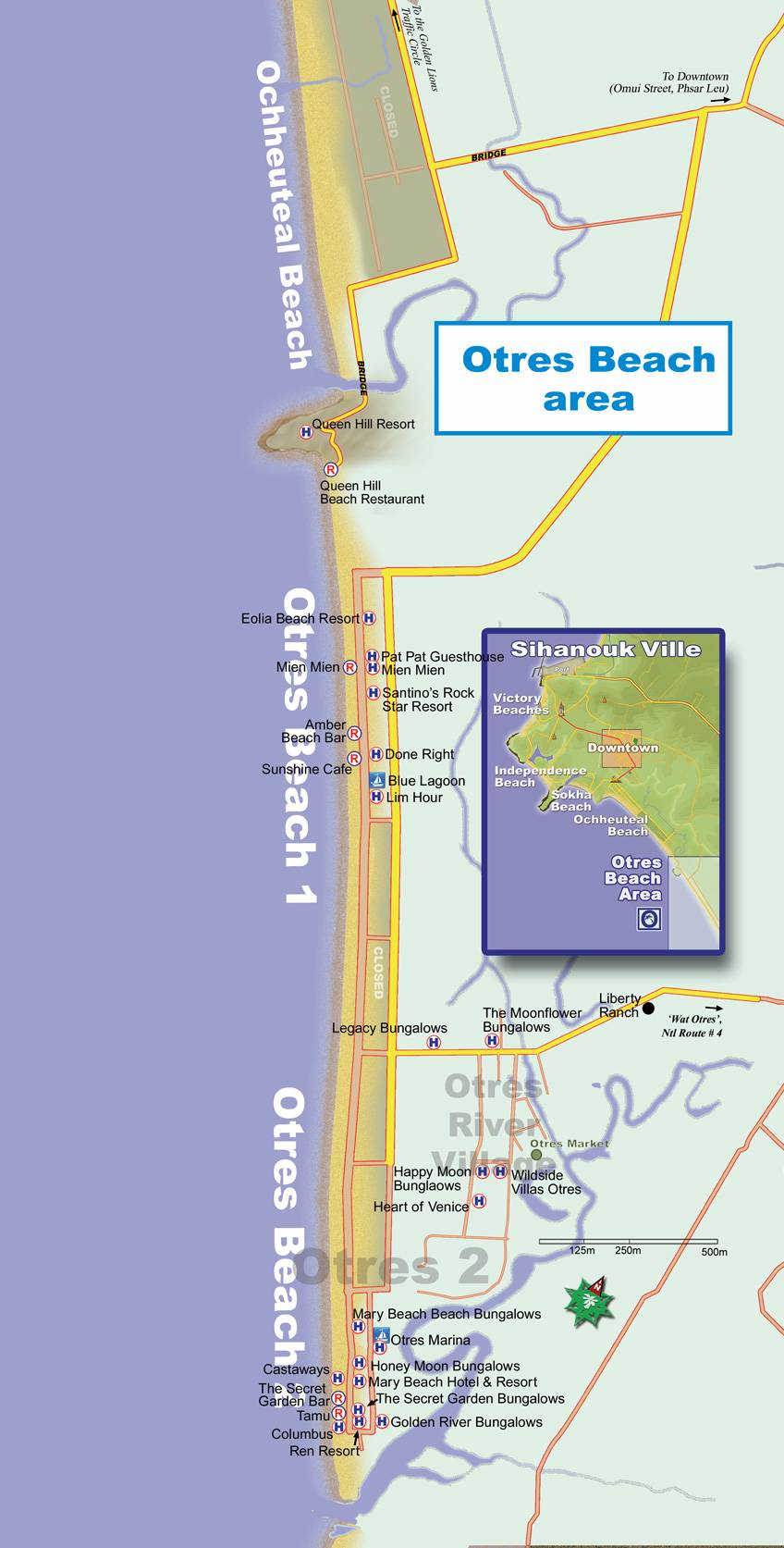 Расположение и схема: к югу от пляжа Очутел (примерно в пяти километрах от города), в завершении череды пляжей Сиануквиля.