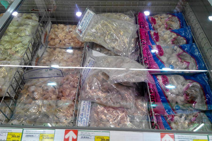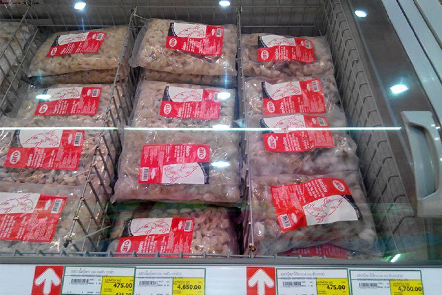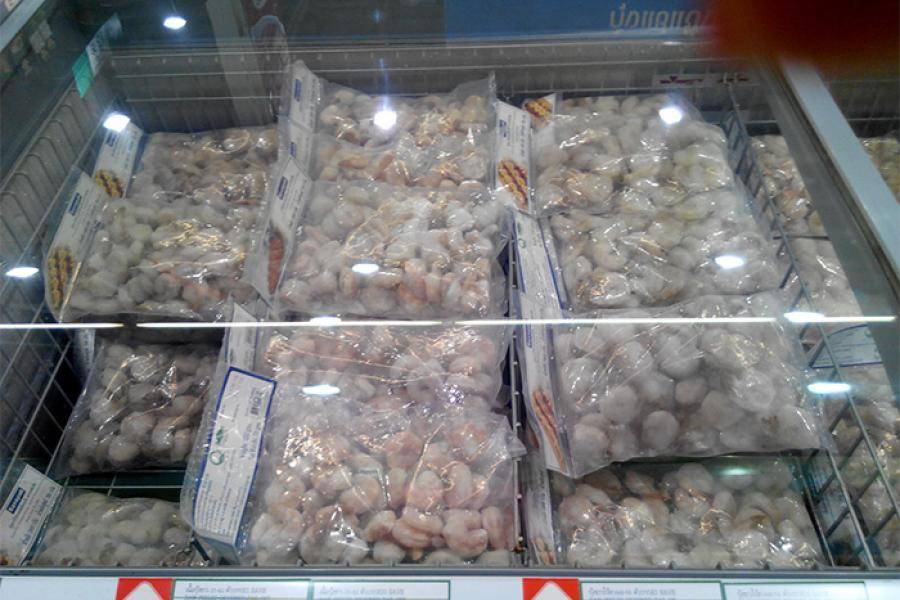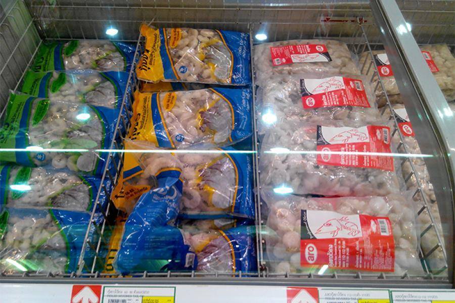 Замороженные королевские креветки стоят 450-600 бат за килограмм. Эти креветки, как и везде в мире, продаются очищенными и бывают замороженными сырыми или варено-мороженными.