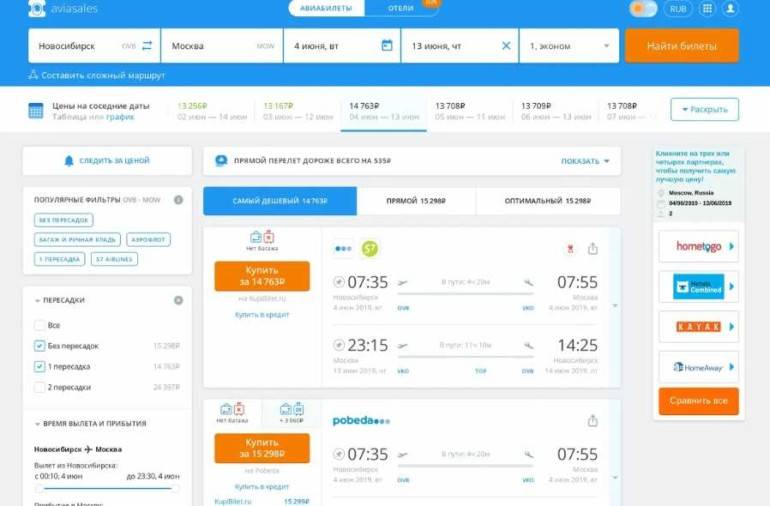 Популярен не только в России, но и во всем мире, недаром работает аж с 2003 года. Поиск ведется более чем по 1200 источникам, так что и вариантов всегда находится масса. Настройки расширенные, удобные: можно выбрать аэропорты и точки назначения, даты, багаж/без него, количество пересадок, класс обслуживания, отфильтровать рейсы по удобному времени и.т.д.
