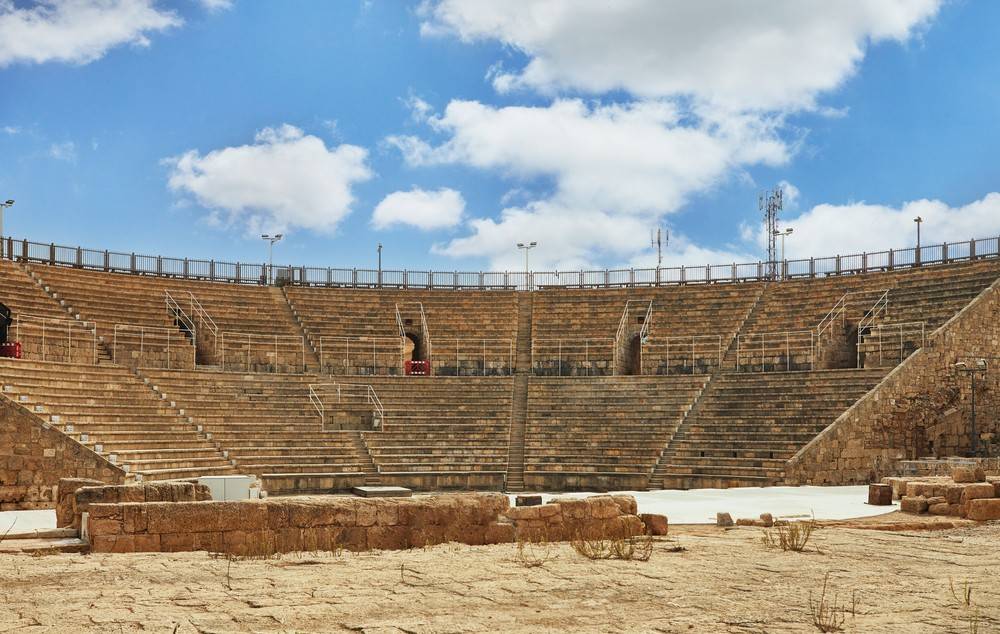 - Амфитеатр Ирода в виде буквы U с огромной вытянутой ареной и рядами сидений. Здесь проводились гонки на колесницах, спортивные соревнования и развлекательные представления. Длина арены составляет более 250 м, ширина – 50м. На двенадцати рядах сидений размещались более 10 000 зрителей.