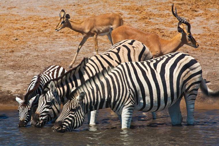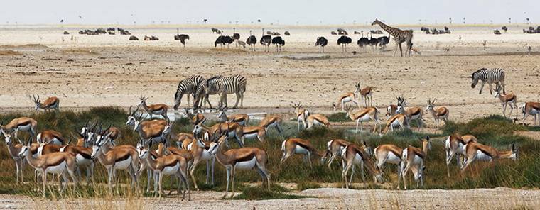 Самое главное на территории парка это наличие водоемов, разбросанных по всей его территории. Места для водопоя концентрируют вокруг себя массу животных. Здесь собирается весь «цвет» африканской саванны. Громадные слоны любят купаться в местных водах. Стада зебр и саблерогих антилоп ориксов, львы и гиены, леопарды и носороги. Все приходят на водопой.