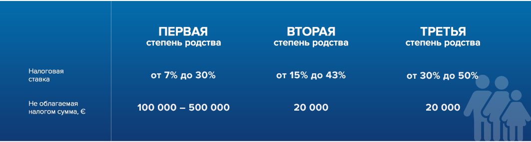 Первая степень родства — супруги и дети, родители, внуки, бабушки и дедушки. Вторая степень родства — брат или сестра, родственники по второму колену, разведенные супруги, приемные родители. Третья степень родства — другие лица, в т. ч. юридические лица.