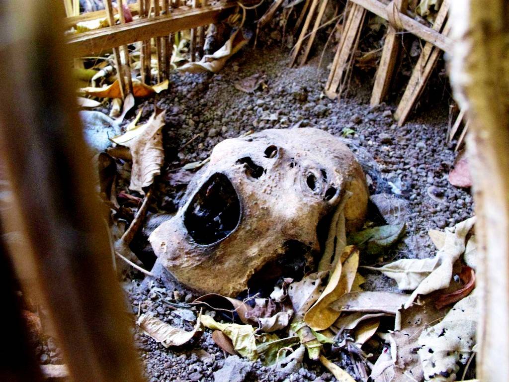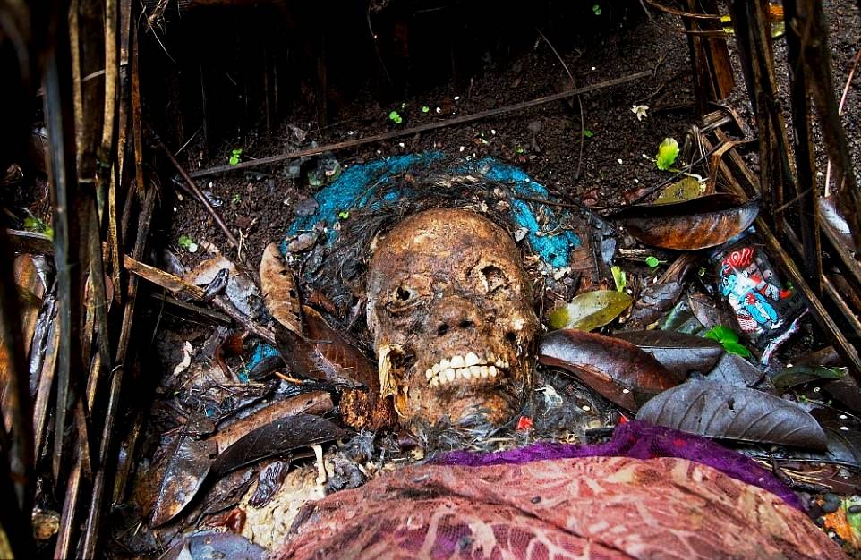 Мертвые тела укладывают в плетеные из бамбуковых веток шалаши или клетки. Эти конструкции защищают мертвецов от обезьян, хищников и других диких животных. Всего на кладбище 11 шалашей. Когда они все заполняются, кости из первого вытаскивают и складывают на каменных ступенях. Там можно увидеть черепа и бедренные кости людей, умерших сотни лет назад. Рядом с покойниками оставляют все предметы, которые привезли из деревни. Тела разлагаются под влиянием ветра и влаги довольно быстро. При этом трупный запах почти не чувствуется. Наверное, ароматное дерево действительно вбирает его.