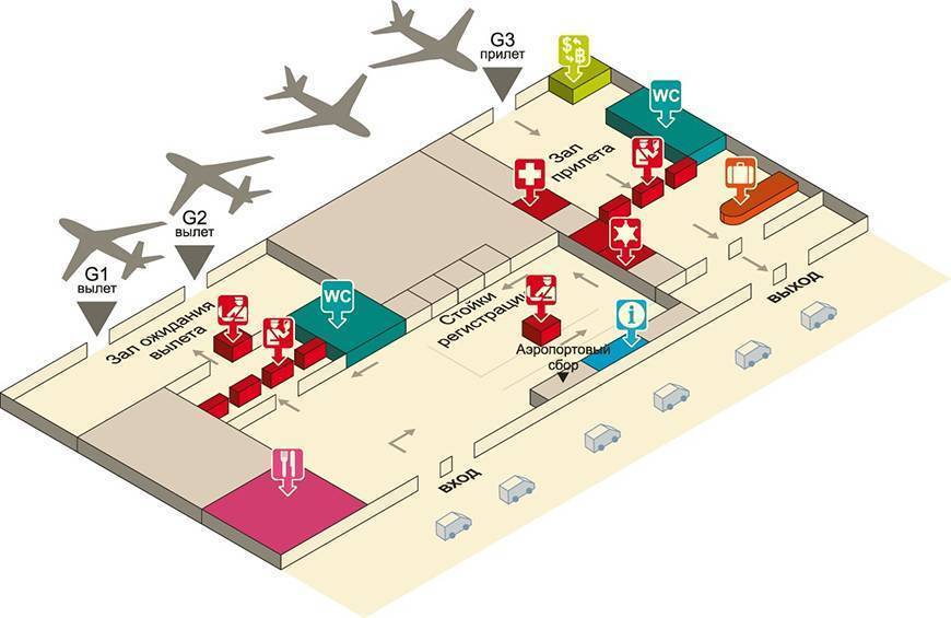 Здание аэропорта небольшое, одноэтажное, залы достаточно просторные, везде чисто. По всем помещениям размещены указатели на нескольких языках, поэтому ориентироваться внутри просто. Если возникли трудности всегда можно обратиться за помощью к сотрудникам аэропорта, которые находятся во всех залах.