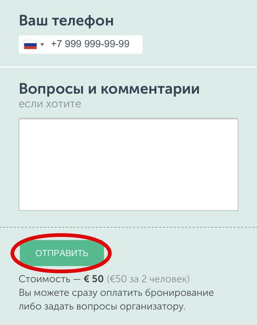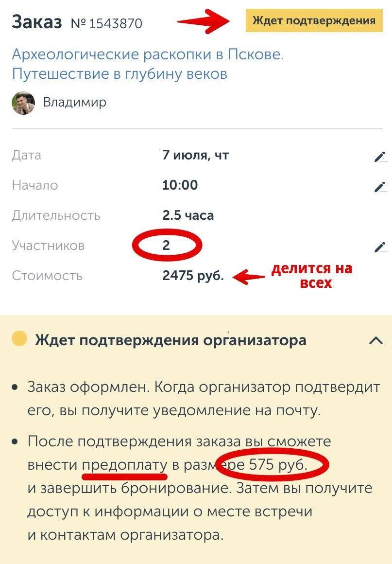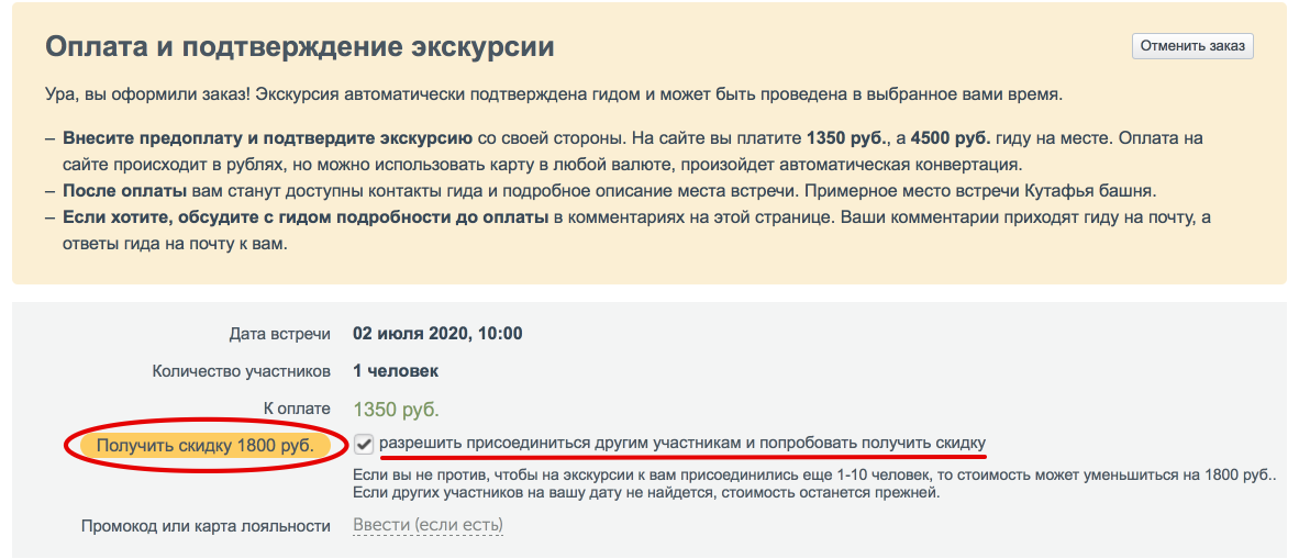 Есть опция сэкономить на индивидуальной экскурсии и разделить расходы с другими возможными её участниками. Поставив эту необязательную галочку, ты выражаешь согласие на то, что к экскурсии могут присоединиться другие незнакомые тебе люди. С этого момента экскурсия обретает формат «мини-группы». Это никак не влияет на размер предоплаты и не гарант того, что скидка применится. Но, ежели на ту же дату и время найдутся и другие желающие — получится сэкономить около 30%. Что, в общем-то, неплохо. Если нет — стоимость останется прежней.
