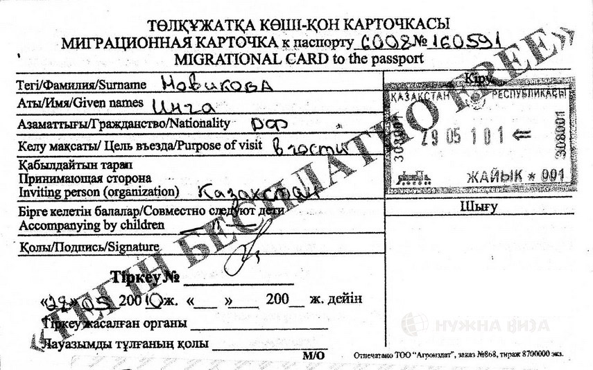 При заполнении карты обязательно указывается ФИО, цель визита и время пребывания в стране. Если с пассажиром едут несовершеннолетние, обязательно указываются данные о них. Если цель визита – выполнение трудовой деятельности, то соответственные данные нужно указать и в бланке. Напомним, гражданам России разрешение на работу в Казахстане не требуется.