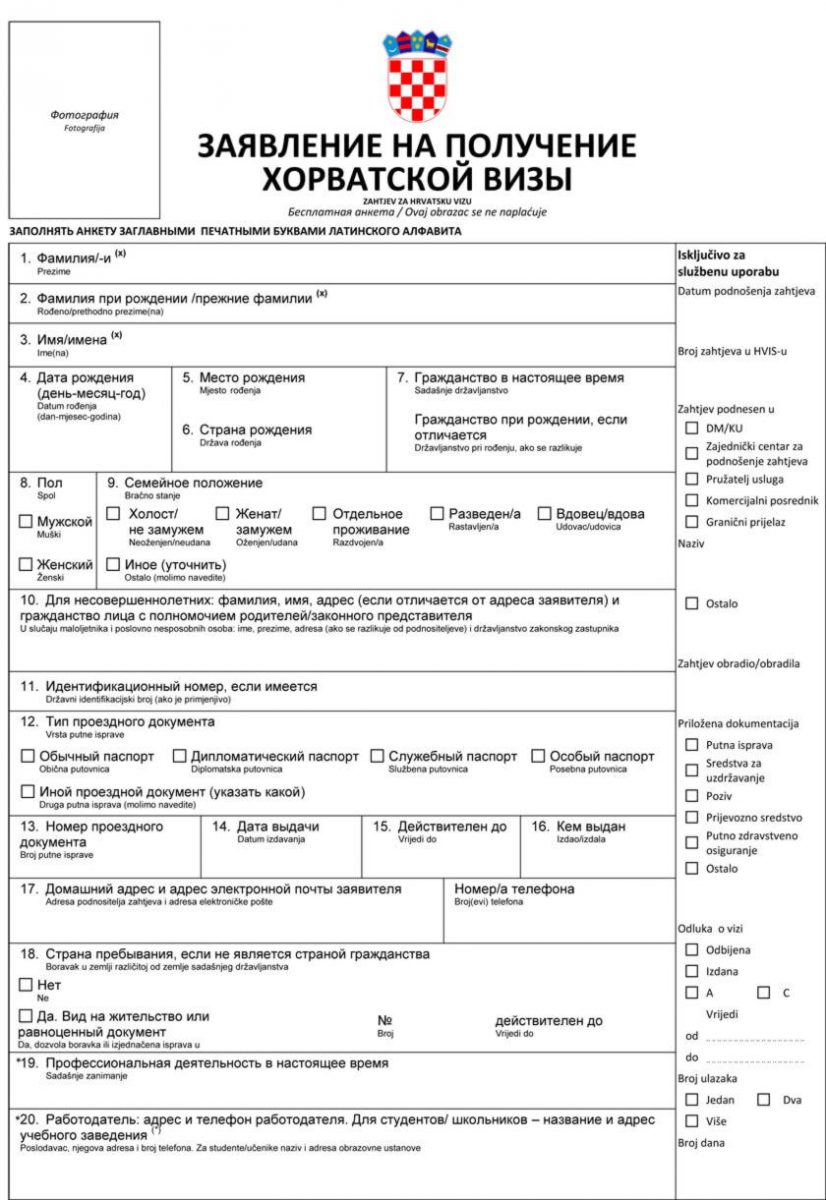 анкета (бумажная или на сайте МИД Хорватии) – заполняется заглавными латинскими буквами);