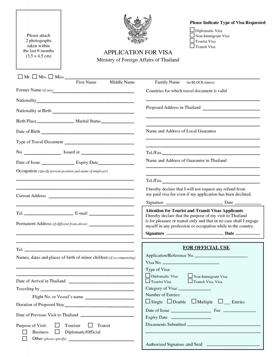 Анкета на визу в Таиланд. Чтобы получить визу, необходимо предоставить в консульство заполненную анкету с подписью заявителя; на детей, вписанных в паспорт родителей, отдельная анкета не заполняется, их данные вписываются в анкету родителей, а фотографии наклеиваются рядом с фотографией родителя на анкету.