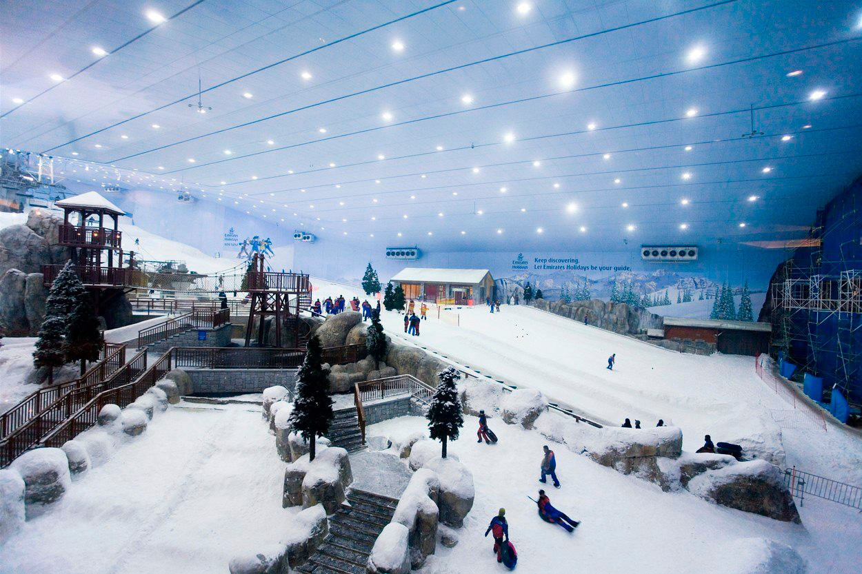 - В торговом центре Ski Dubai находится удивительная локация – небольшая горнолыжная трасса, покрытая искусственным снегом. Посетители из летней жары попадают в зимний холод, от которого спасает выданная тёплая одежда. Подъёмники доставляют лыжников в полной амуниции на верхушку заснеженного склона, и они оттуда спускаются на лыжах.