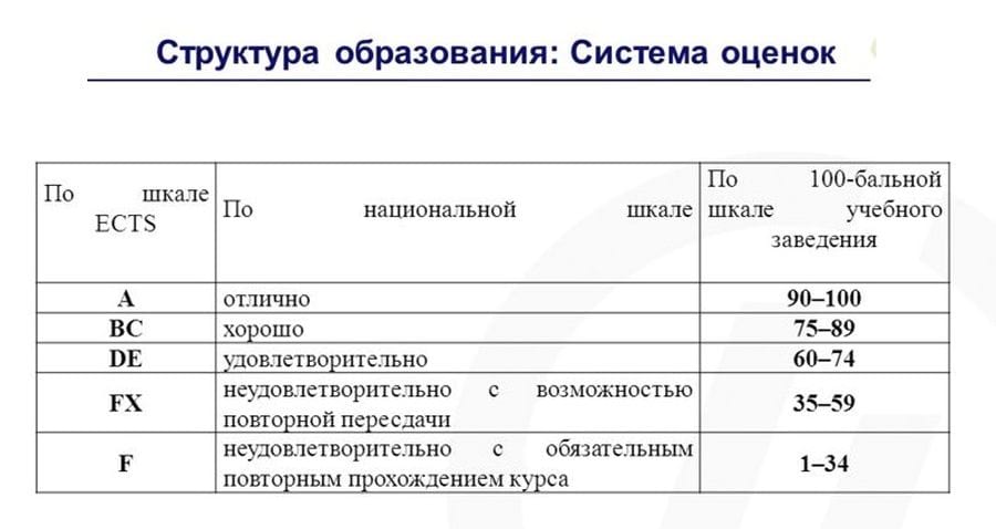 Система оценок По шкале ECTSСистема оценки знаний буквенная, шестибальная: от A до F:
