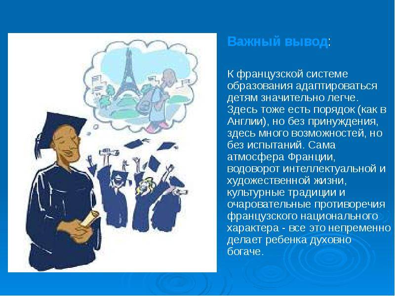 Образовательная система Франции почти ничем не отличается от образовательных систем стран “старой” Европы. Система состоит из 4 основных этапов – это дошкольное, начальное, среднее и высшее образование.