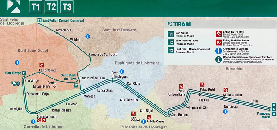 Маршруты Trambaix связывает район Баш-Льобрегат с Барселоной, с конечной остановкой T1, T2 и T3 – площадью Francesc Macia.