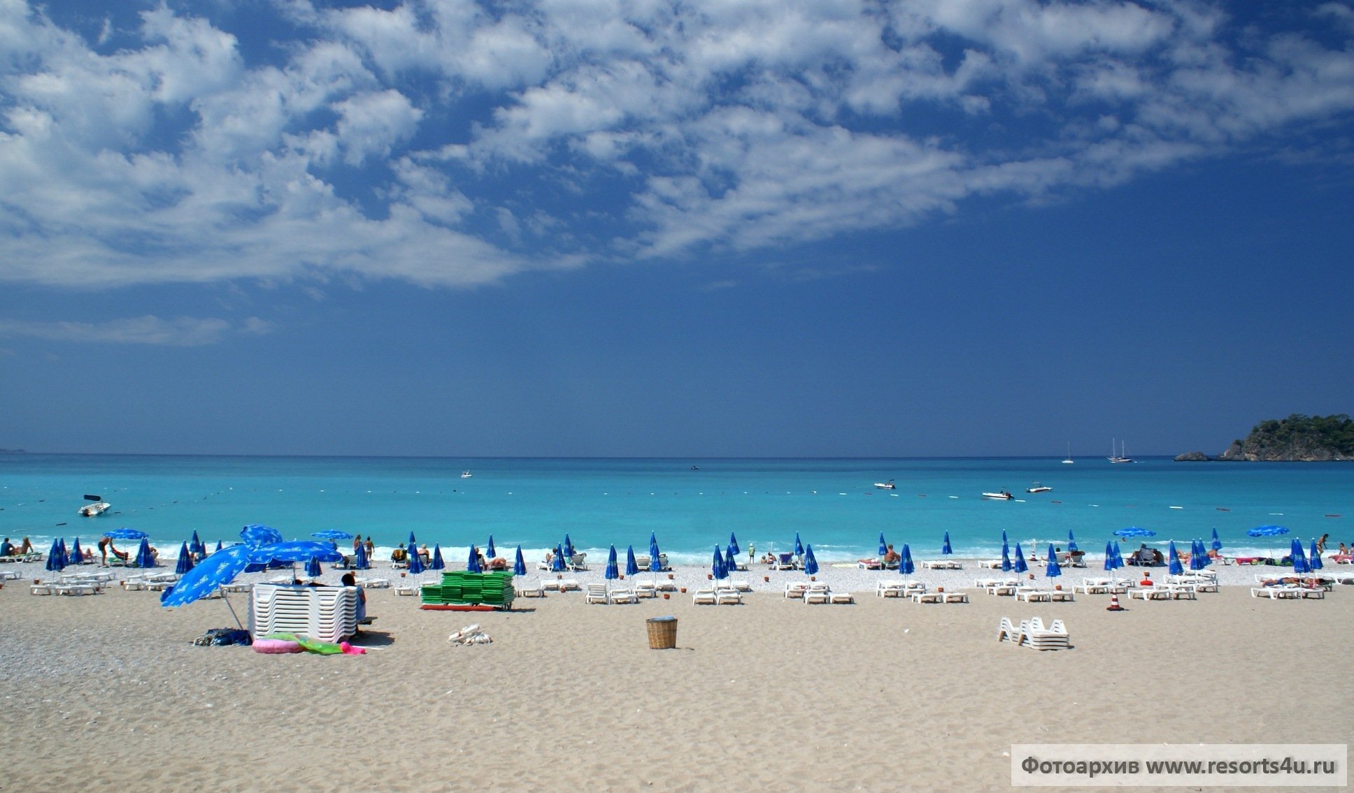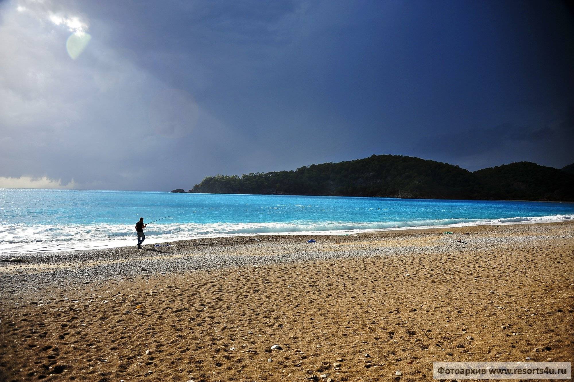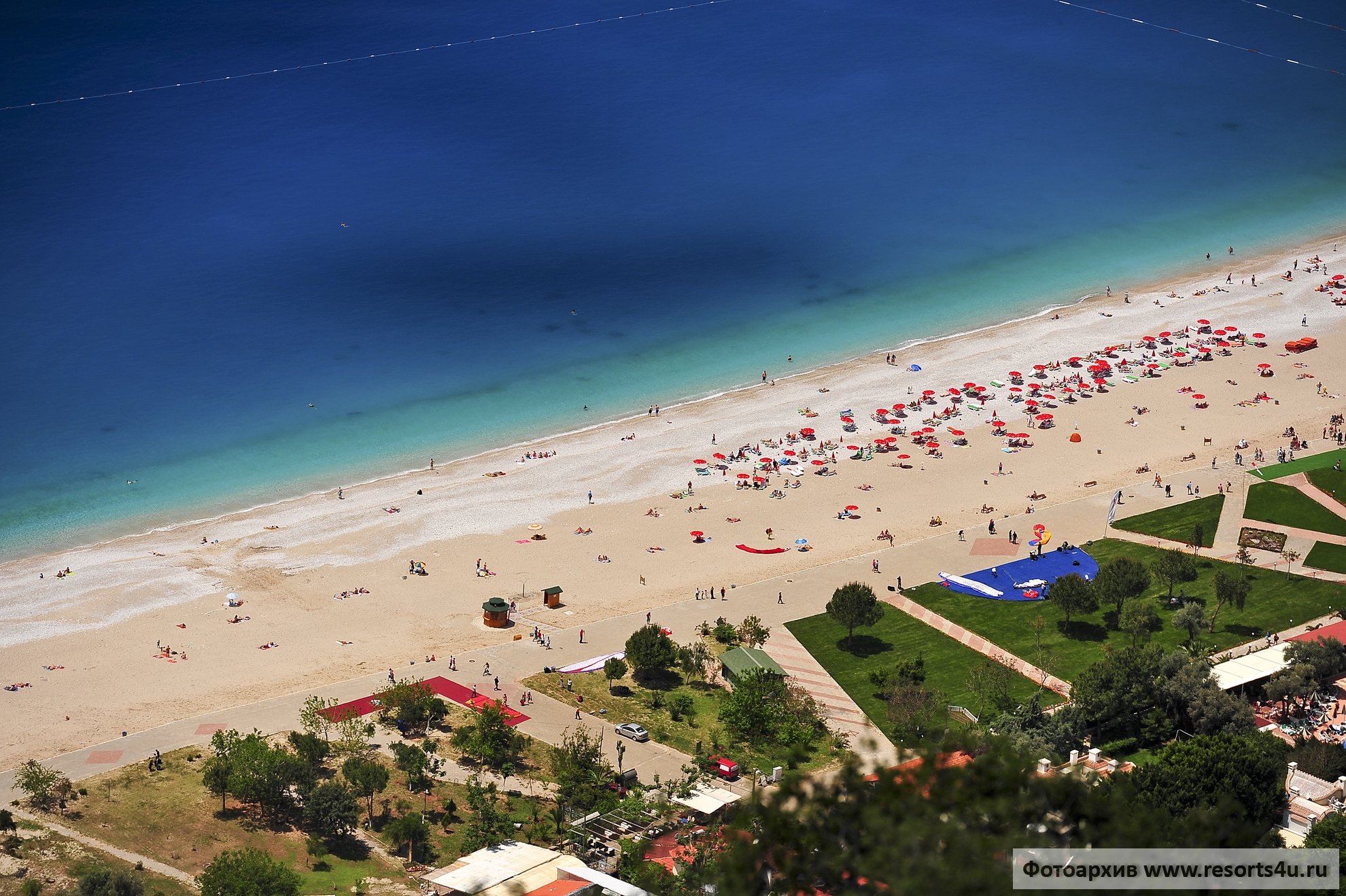 Самый протяженный участок пляжа – Кумбурну. Это широкая коса, врезающаяся полуостровом в море. Она отделяет от него залив, и закрывает от ветра и течений. В лагуне живет несколько видов рыб, крабы и черепахи. Вода в лагуне изумрудно-зеленая. - Бельджекиз. Этот песчано-галечный пляж – самый протяженный в Олюдениз. Одна его сторона плавно соединяется с пляжами и косой Голубой лагуны, другая упирается в скалы, которые окружают бухту. Пляжу присвоен Голубой флаг – за экологичность и чистоту.