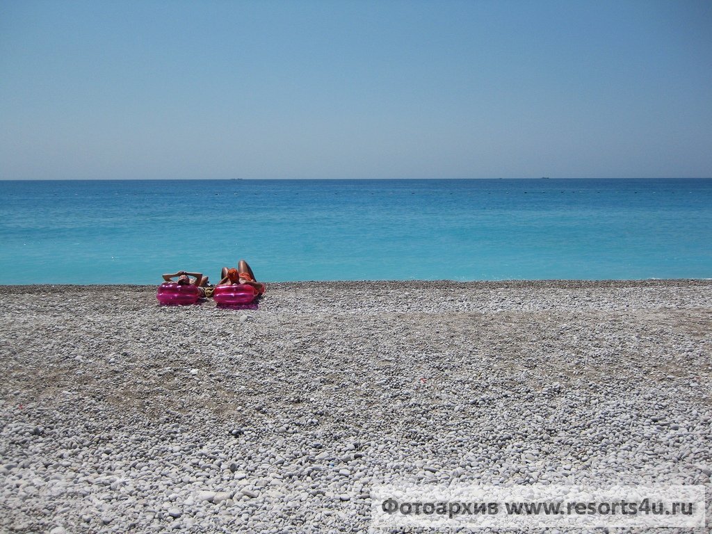Сам пляж песчано-галечный: ближе к променаду он покрыт серым кварцевым песком, по мере приближения к морю песок переходит в гальку. Со стороны скал галька довольно крупная, ближе к лагуне становится заметно мельче.