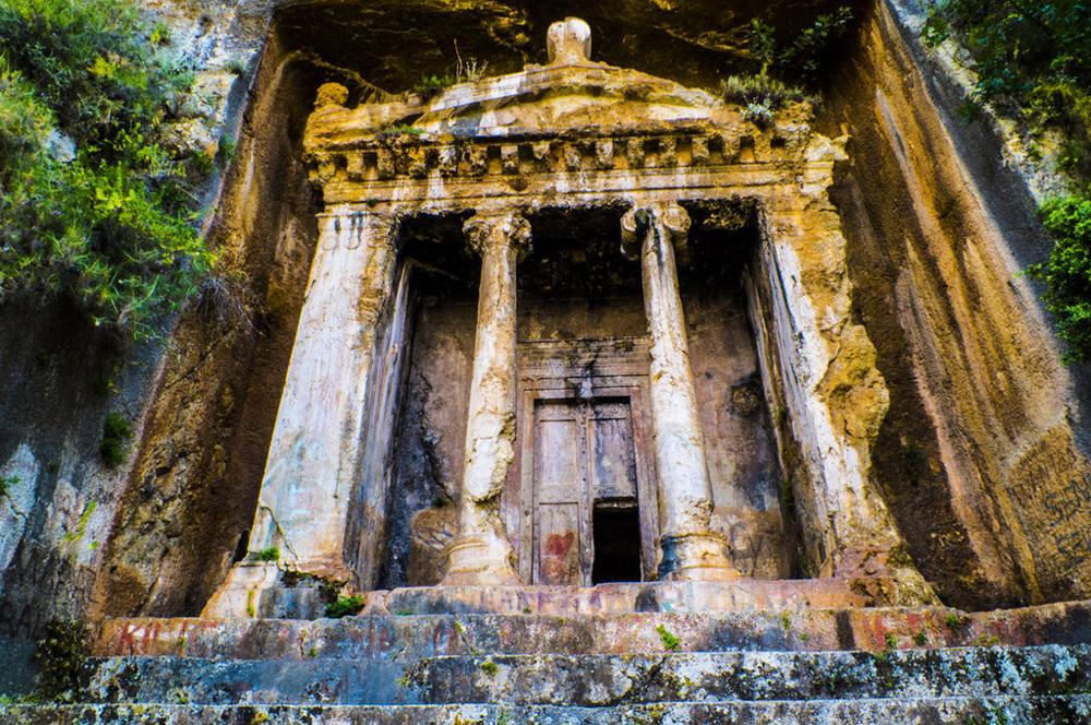 Это монументальное сооружение является памятником греческой культуры и датируется примерно 350 годом до н.э. Гробница правителя древней Ликии царя Аминтаса, высечена высоко в скале. Вход ее украшен аркой с колоннами высотой более 12 м.