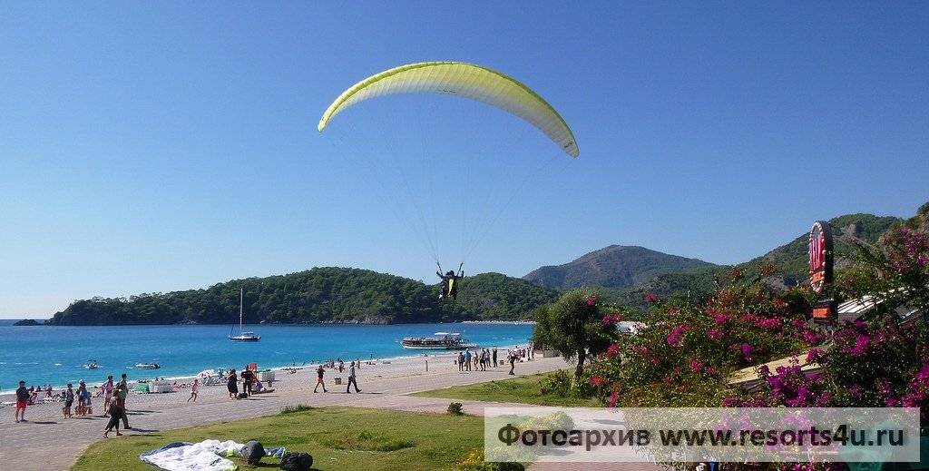 Горное окружение Голубой лагуны давно облюбовано парапланеристами как наиболее благоприятное по своим природным условиям место для полетов. Поэтому к традиционным удовольствиям пляжного отдыха здесь прибавляется еще одно развлечение. Интересно наблюдать за парящими в воздухе парапланами, но еще интереснее – присоединиться к ним в воздушном полете.