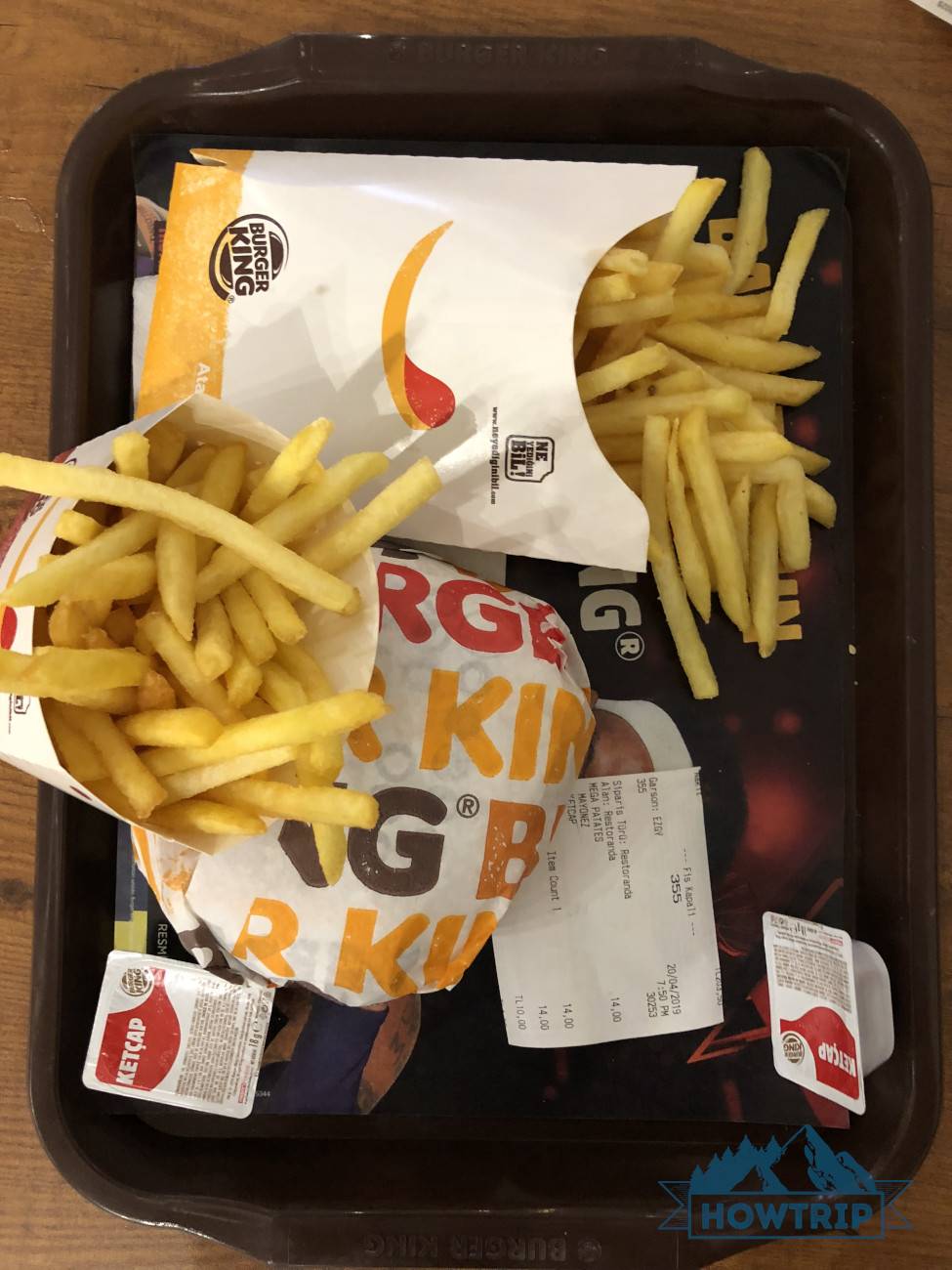 Учтите, что ради фаст-фуда и недоброжелательного отношения придется угробить минимум полчаса, чтобы получить бумажку, 10 минут, чтобы дойти с чемоданами-рюкзаками и еще минут 40, чтобы заказать. Хотя делать-то 5 часов все равно нечего