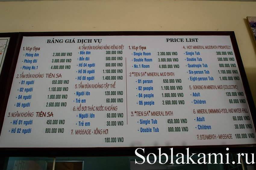 Вам лишь стоит доехать до грязевых источников самостоятельно, а затем на месте решить, чего вам хочется. Если вы просто решили поплавать в бассейнах с термальной водой, принять душ Шарко и понежиться в джакузи, то заплатите всего 3 доллара с человека. Если же хотите грязевую ванную, да еще и с массажем, это будет стоить дороже. Вот прайсы на услуги внутри Тхап Ба.