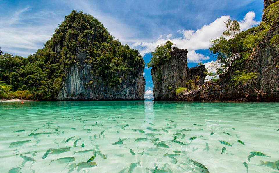 Есть здесь места, глядя на которые, не верится, что это видишь в реальности. Громадные отвесные скалы, стоящие, как грозные часовые, по обеим сторонам узкого пролива; или нависающие горизонтально над берегом – вряд ли где ещё можно такое увидеть! На чудесных пляжах островов с невероятно чистым песком и морем обеспечен замечательный активный отдых: здесь занимаются дайвингом, сноркелингом, рыбалкой, катанием на лодках. В окрестностях очень интересные туристические объекты: пещера Викингов (о. Пхи Пхи Лей), бухта Майя, прославившаяся съёмками голливудского фильма «Пляж» с Лео Каприо; впечатляет посещение смотровой площадки(о Пхи Пхи Дон), с которой можно увидеть потрясающие красоты всего архипелага.