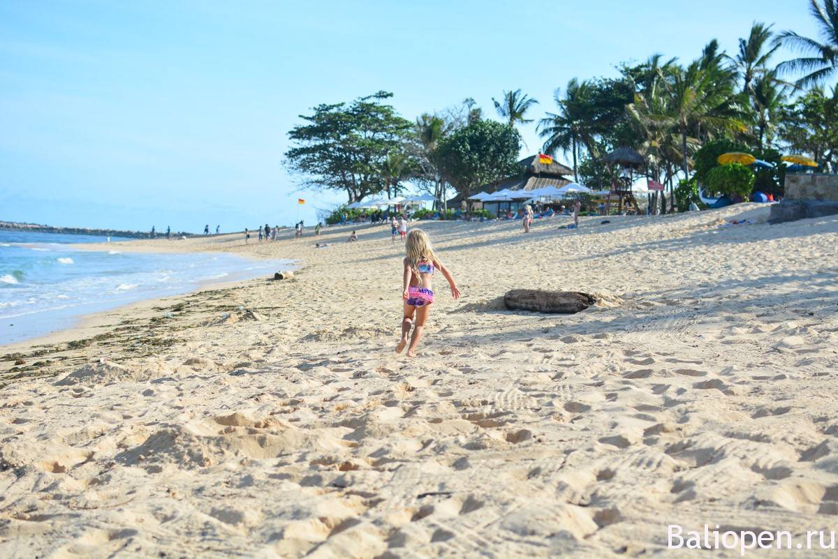 Но все же есть пляжи, которые ориентированы на семейный отдых. Отдельно стоит выделить курорт Нуса-Дуа. Протяженность береговой линии составляет 3 километра, усыпана мягким и белоснежным песком. Спуск в воду пологий, на дне нет камней и острых ракушек. Недалеко от пляжа находится коралловый риф, который защищает побережье от порывистых ветров.