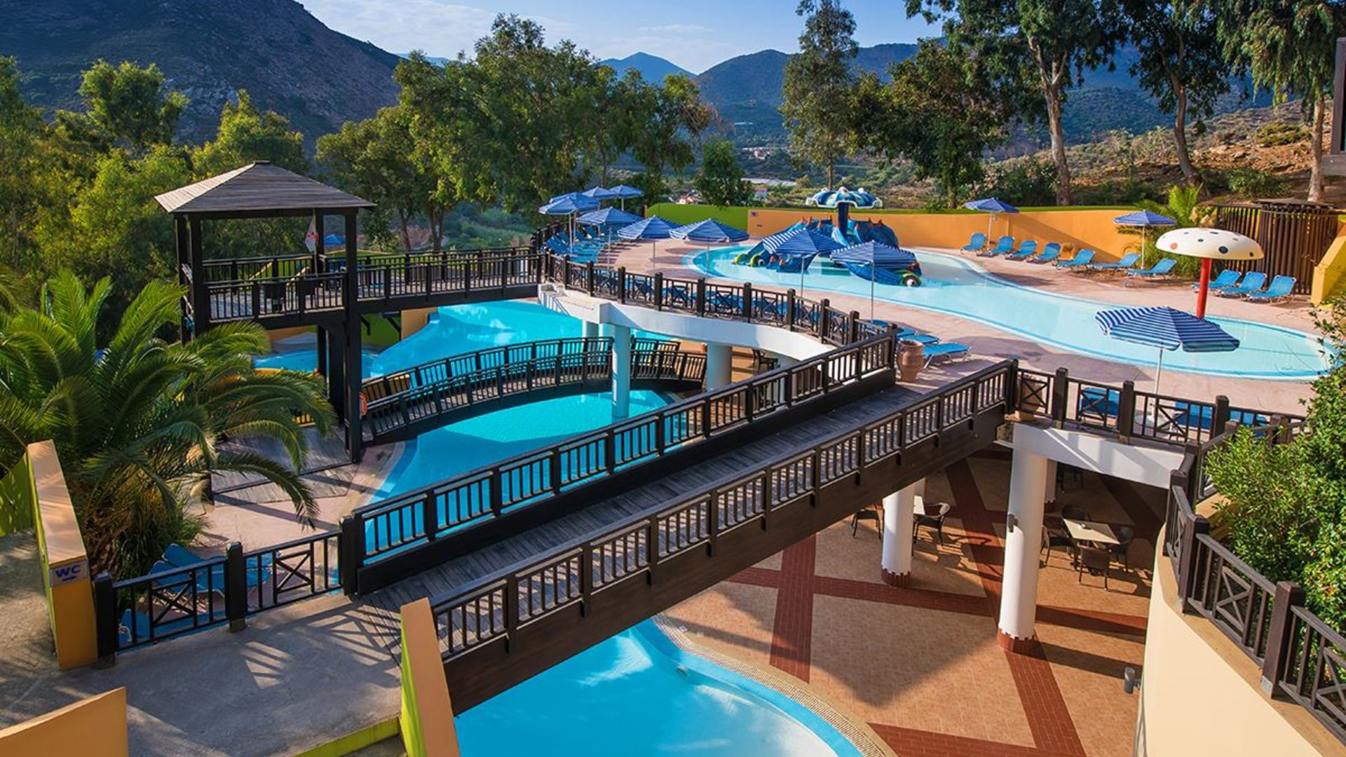 Самый богатый выбор горок в отеле Fodele Beach 5*, расположенном на севере острова. Оснащение аквапарка включает 7 трасс различной степени экстремальности.