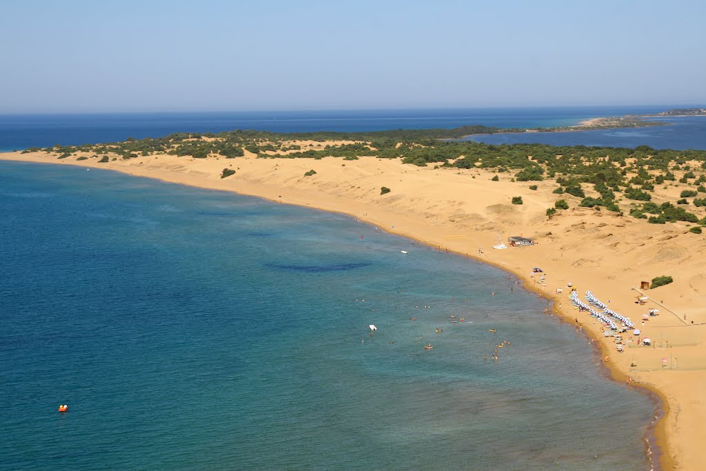 Пляж, имеющий награду Голубой флаг как самый чистый, ухоженный и безопасный для всех. Детей постарше и взрослых здесь ждут водные виды спорта и развлечения на воде. Малышей и их мам порадует «мелкая вода», в которой комфортно и весело плескаться. Место обустроено и имеет все, чтобы провести здесь весь день и встретить закат не выезжая за провизией или лопнувшим резиновым кругом. Таверны, магазинчики и бары рядом.