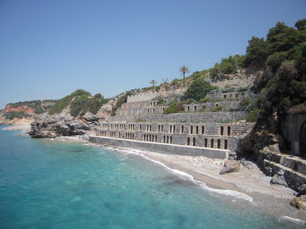 На восток от мыса Карабурун побережье переменчивое. Встречаются песчаные и галечные пляжи, однако большая часть берега скалистая. Здесь отели устраивают «террасные пляжи», то есть, строят большие деревянные настилы, на них устанавливают лежаки и зонтики, а попасть в море можно по лестнице. Не всех туристов устраивает такой вариант, а для отдыха с детьми эти настилы совсем не подходят.