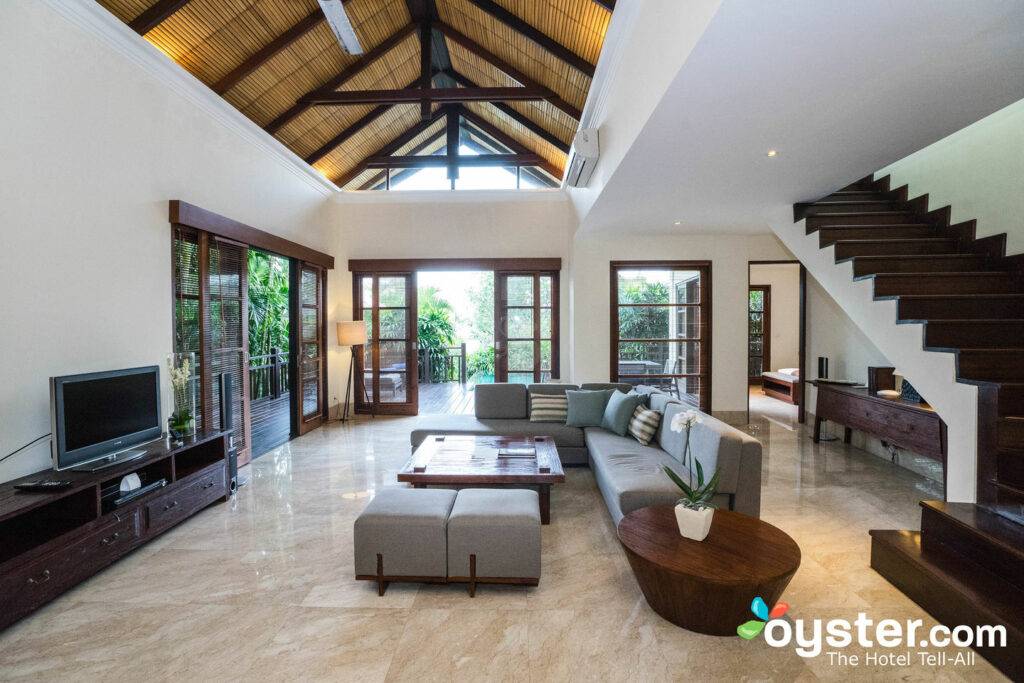 Karma Kandara offers 54 villas, each set in a private garden with an infinity pool. Villas range from spacious one-bedroom units with living areas to massive 12,917-square-foot five-bedroom units with two pools, a private gym, a spa, and an on-site movie theater. Villas have a stylish blend of elegant contemporary decor and traditional Balinese details, including wood carvings, dark wooden floors, grass-and-wood ceilings, and local stone accents. Four-poster beds with muslin drapes, and iridescent silks in caramel, red, and burgundy hues lend spaces lots of local charm, while gleaming veined floors and the mix of heavy wooden furniture and gray couches make for sleek living areas.