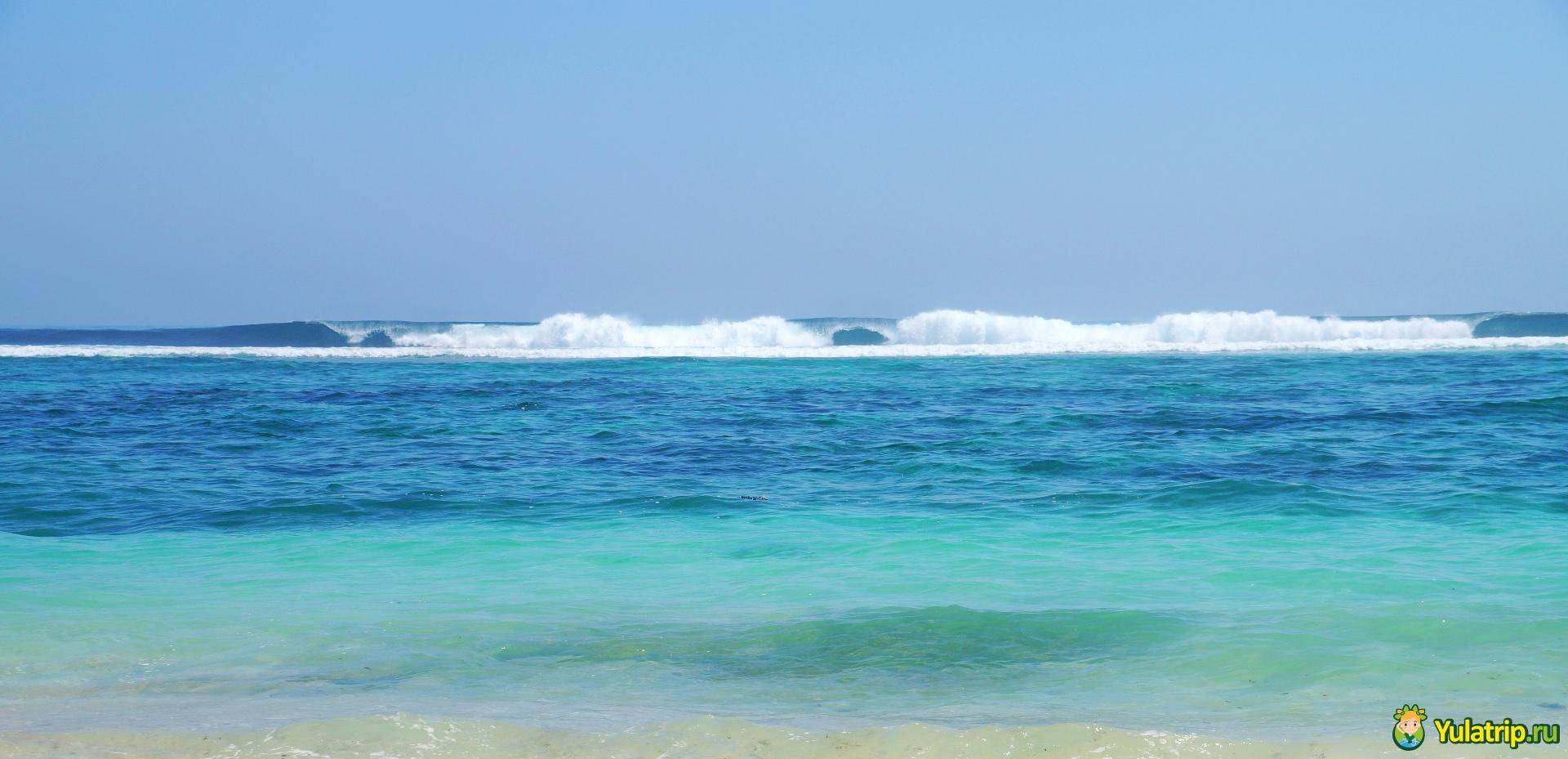 На скале, наверху, перед лестницей есть небольшое место для парковки байков и здесь же открывается потрясающий вид на бескрайний синий океан плавно сливающийся с голубым небом. Вдалеке волны одна за другой разбиваются о риф. Можно сидеть и смотреть долго-долго.