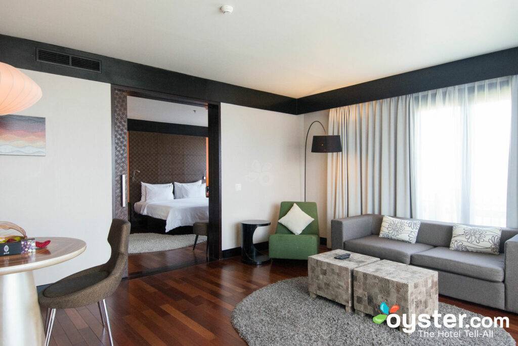 Simple and stylish, the rooms at the Pullman Bali Legian Beach range from Deluxe Rooms with one king-sized or two twin beds to spacious two-bedroom suites. All look new, modern, and clean. Wood floors, bright-orange accent walls, and floor-to-ceiling headboards flank comfy beds. All rooms have furnished balconies, free Wi-Fi, flat-screen TVs, and minibars. As an added bonus, beach baskets and beach towels are available for guest use, and yoga mats and weights are available for in-room workouts. Guests are greeted in rooms with fruit baskets and Balinese souvenirs.