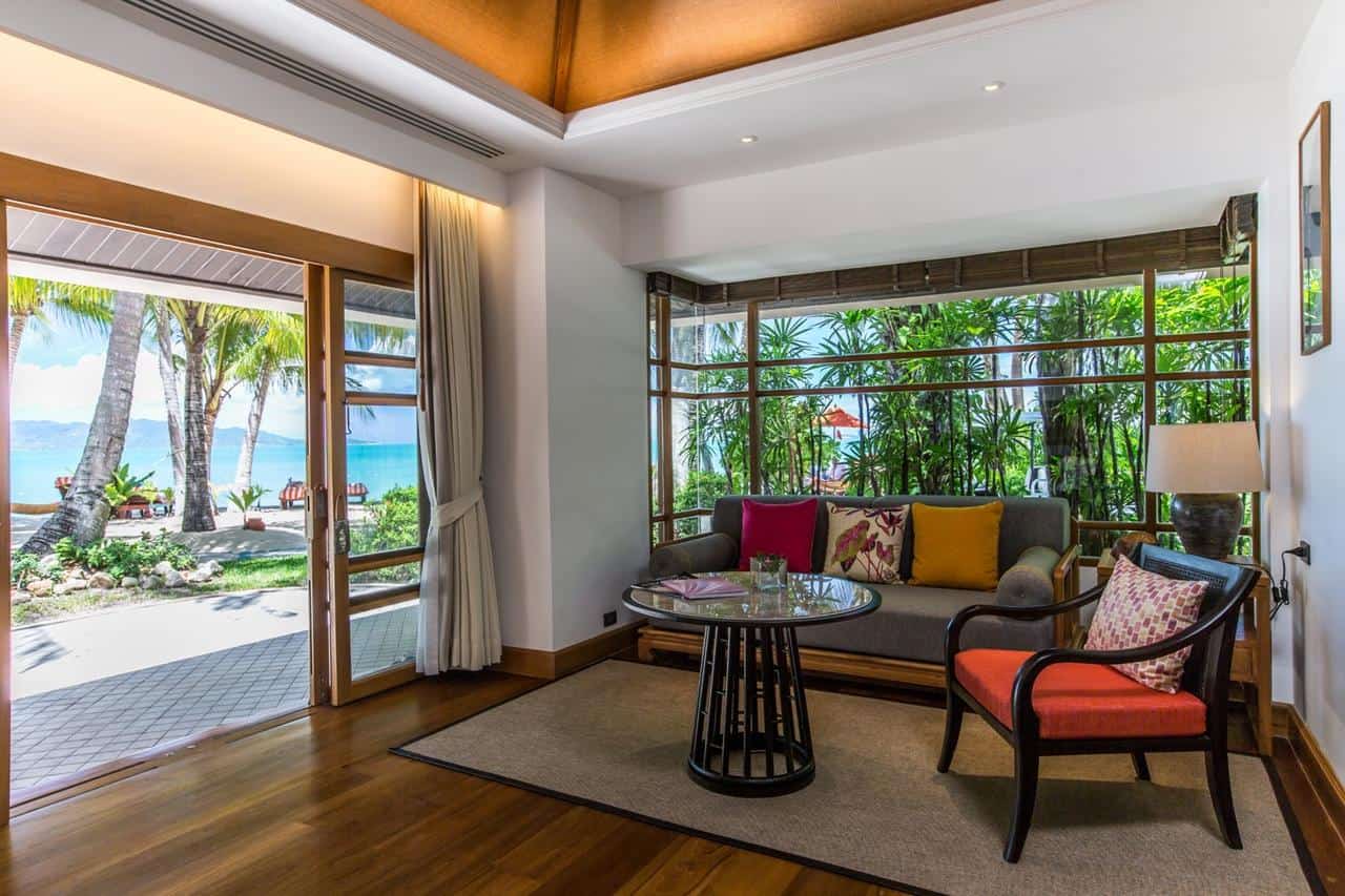 Из 5-звездочных отелей на берегу моря я могу посоветовать Anantara Lawana Koh Samui Resort. Он имеет бесплатный wi-fi в номерах, тренажерный зал, сауну, гольф-поле, бассейн, приветливый персонал. Оформлен в изысканном европейском стиле.