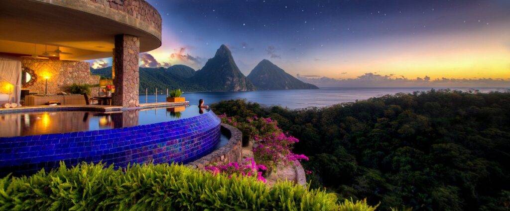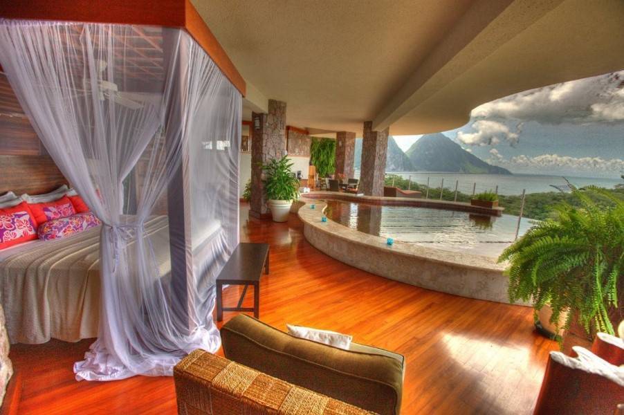Небольшой роскошный отель Jade Mountain Resort находится на островном государстве Сент-Люсия, в восточной части Карибского моря. Сент-Люсия славится пляжами с вулканическим песком, живописными тропическими лесами с водопадами, первоклассным дайвингом среди рифов и множеством шикарных отелей на побережье.