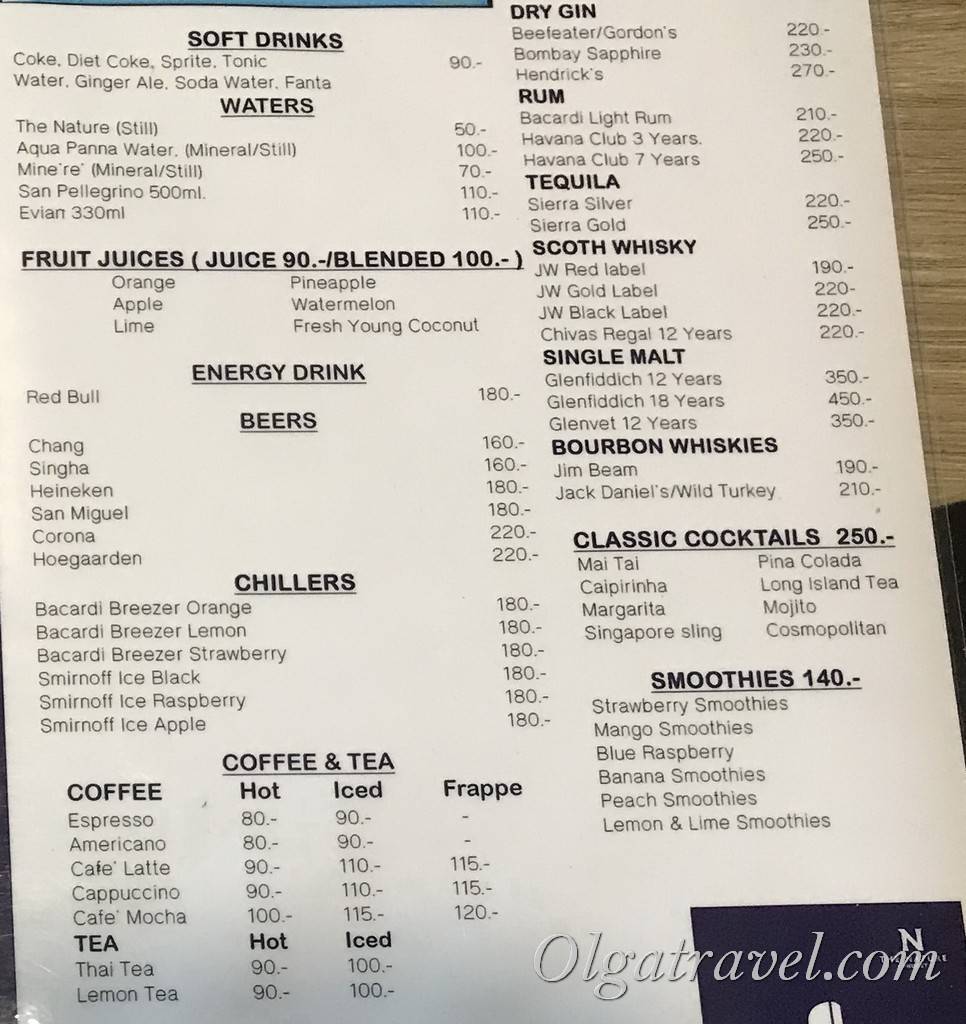 В ресторане Nour цены ниже, постоянно какие-то акции. Например, пицца и два напитка 300 бат.