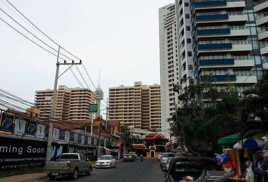 На этом фото они же справа (еле торчат скраю), а сразу за ними видно 2 корпуса View talay 3 и View talay 4 (желтые здания), бюджетные кондо, хороший бассейн. Ну а за ними уже начинается большой отель с аквапарком Паттайя Парк (торчащий на заднем плане белый шпиль), дальше есть еще несколько интересных вариантов для жилья, но я их отношу к району Джомтьен.