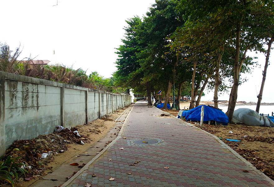 Выгодное преимущество пляжной зоны — тенистая пешеходная набережная, от которой к морю отходят дорожки, выложенные тротуарной плиткой. Дорога закрыта для движения мотобайков до 18:00. Пальмовые аллеи перемежаются казуаринами, похожими на сосны, и вечнозелеными лиственными деревьями Terminalia catappa, больше известными как «индийский миндаль». Под раскидистыми кронами можно комфортно расположиться на циновке, как это делают тайские компании.
