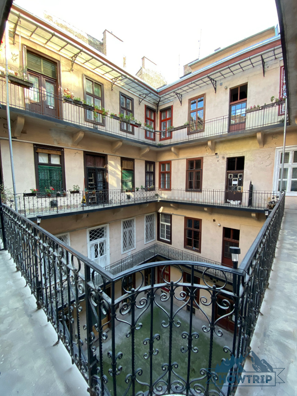 Здесь мы останавливались на 3 ночи, снимали за 3000 рублей в сутки на двоих в низкий сезон. Расположена она на стыке районов Терезварош и Белварош-Липотварош. Квартира двухуровневая, все при ней, находится в доме с внутренним двориком – фишка Будапешта, схожая с Питером.