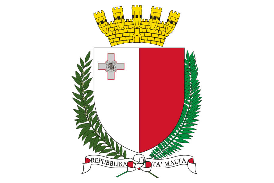 Герб Мальты — треугольный щит, который разделен на красную и серебряную части. В левом верхнем углу — Георгиевский крест, сверху — корона, которая напоминает крепостные сооружения Мальты. Оливковая и пальмовая ветвь обозначают мир и природу. Герб утвержден в 1988 году