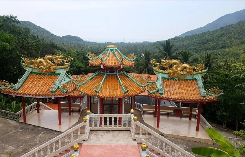 Посередине острова Панган проходит дорога, соединяющая север и юг. Если ехать по этой дороге в сторону юга, то можно заметить китайский буддийский храм стоящий на холме. Мы, конечно, повидали красивых храмов в Таиланде, ну всё равно захотелось заехать и взглянуть на этот не такой старинный храм (ему примерно 20 лет). Разноцветные, яркие рисунки, украшающие храм, выглядят мило на фоне высоких зеленых холмов с пальмами и моря.