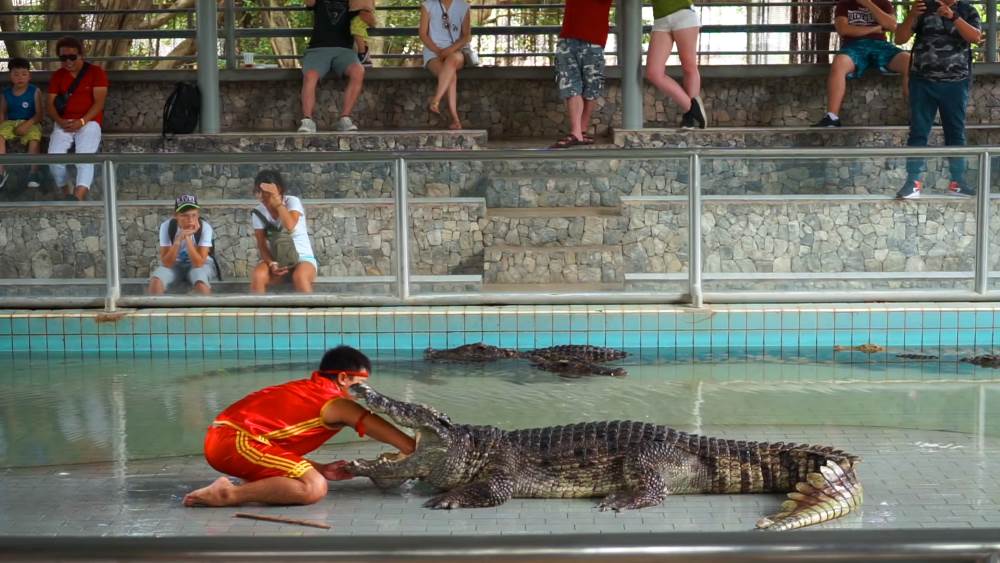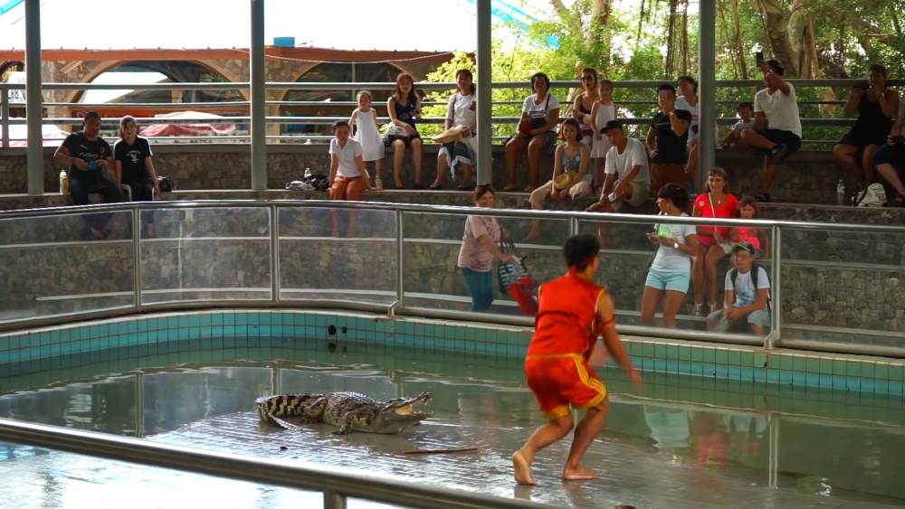 Существует мнение, что крокодилы не поддаются дрессировке. Вопреки этому мнению в течение дня проводятся представления, где отважные шоумены буквально ходят по лезвию ножа, вернее, кинжально острого зуба. Они бесстрашно берут рептилий на руки, засовывают им в пасть руки и головы, таскают за хвост, как резиновые игрушки.