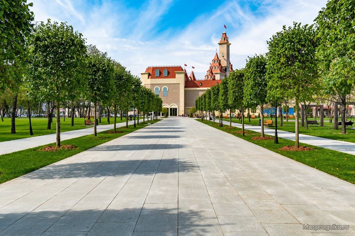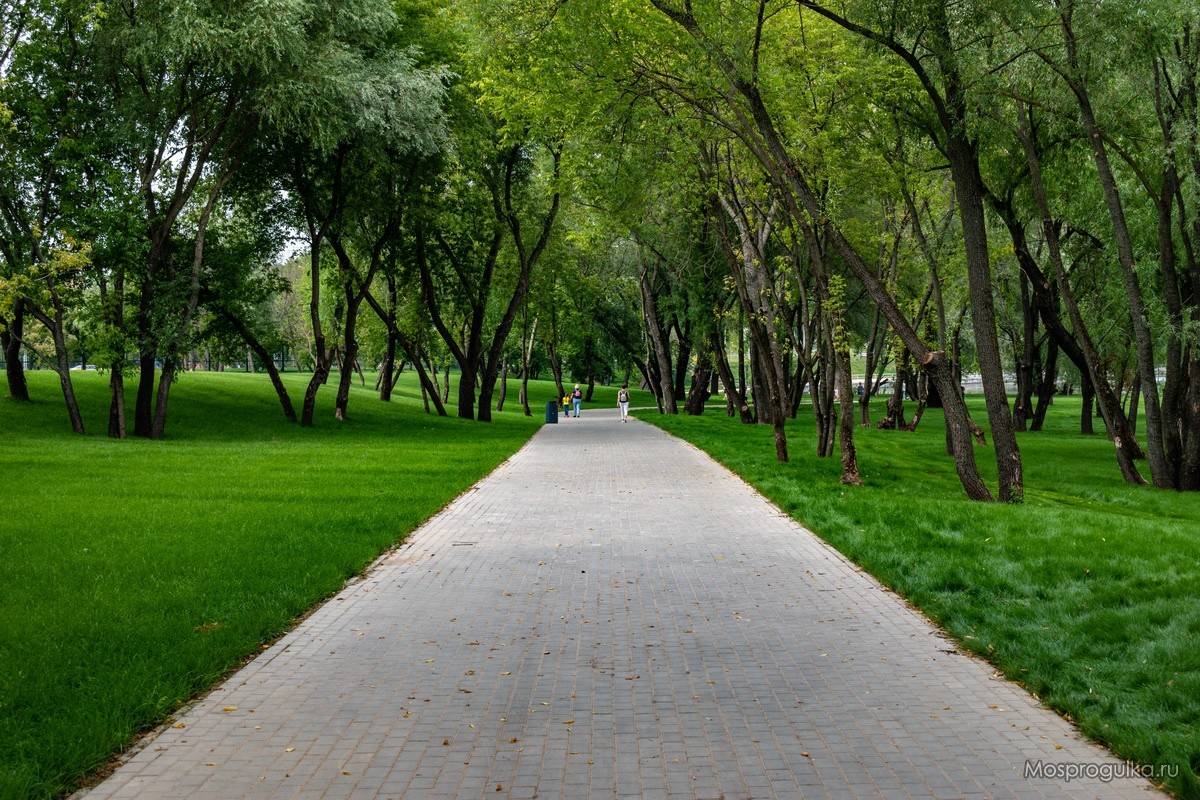 По его территории также проходит развитая сеть пешеходных аллей, вдоль которых можно обнаружить лавочки и шезлонги, но в целом он выглядит более регулярным. Здесь разбиты красивые клумбы, а на центральной аллее высажены аккуратные липы, кроны которых подстрижены в кубической форме.
