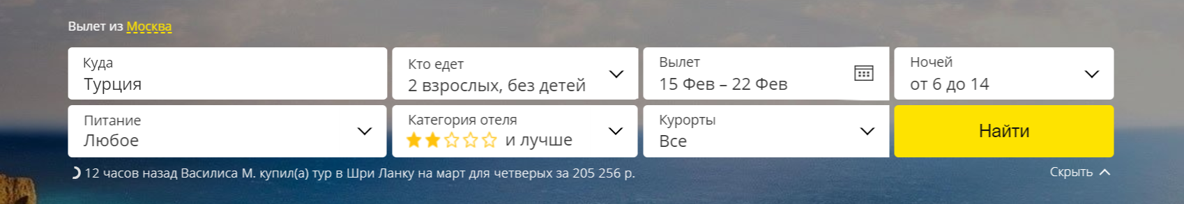 Вы сами выбираете тур по разным параметрам: страна, количество людей, дата вылета, длительность, питание, категория отеля, курорты, близость к пляжу, рейтинг отеля. А если выбирать и сравнивать не хочется, можно просто позвонить менеджеру — он с вами пообщается и поможет с выбором.