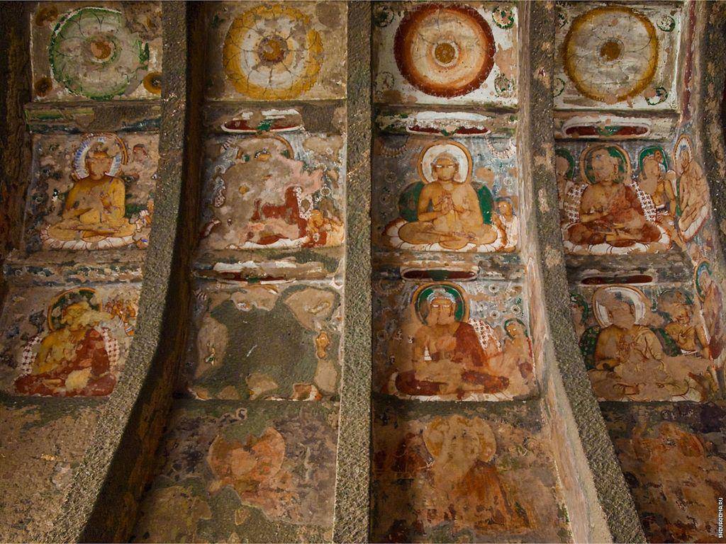 При Гуптах большие буддийские общины еще могли создавать монастыри и пещерные храмы. Более всего знамениты буддийские пещеры в Аджанте. Создание первых относят к II в. до н. э., а время постройки последних – 642 г. Всего в Аджанте насчитывается 29 пещер (все они пронумерованы), из них 5 храмов и 24 монастыря. Самые поздние сооружения отличаются изящной золоченой отделкой, роскошным декором, обилием стенописи и скульптур. На фасаде пещеры № 19, созданной около 500 г., изобилуют рельефные фигуры, обрамление окон имеет килевидную форму. Колонны в пещере завершены широкими капителями со сложными рельефными композициями. На монолите ступы – рельефное изображение Будды. Потолок храма словно иссечен глубокими бороздами, создающими в помещении контрастные светотени. Освещение здесь также играет огромную роль.