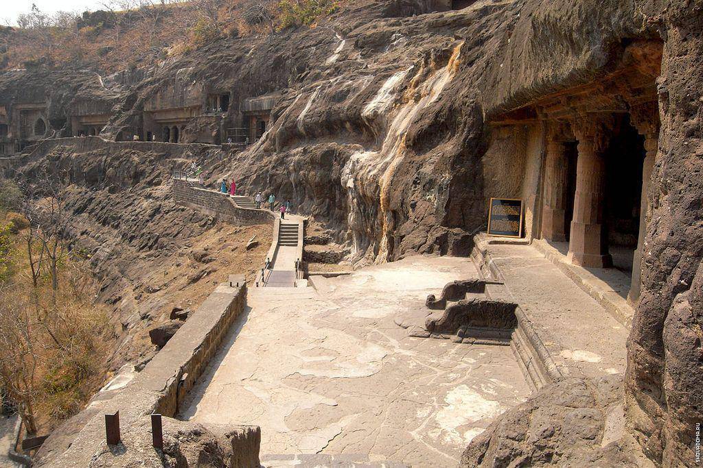 Пещеры выбиты в базальтовой скале – части траппового плато Декан. Эта скала в форме подковы окаймляет изгиб небольшой реки Вагоры. Тихое место привлекло буддийских монахов, уединявшихся в свое время в пещерах Аджанты для молитвы. От каждой пещеры к реке вели ступени, сейчас почти не сохранившиеся.