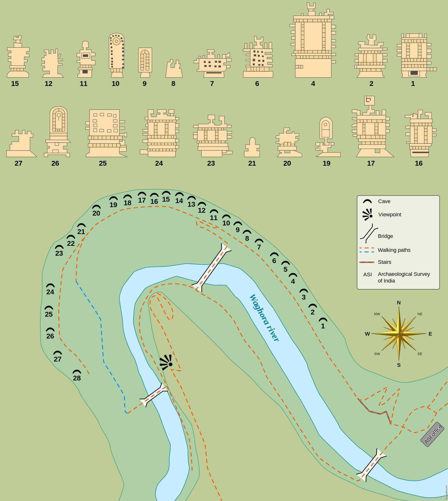 Сейчас вдоль пещер проложены дорожки, но в древности к каждой из них приходилось подниматься по отдельной деревянной лестнице или каменным ступеням от берега речки на высоту до 35 м. Для простоты описания все пещеры пронумерованы с востока на запад — от 1 до 29.