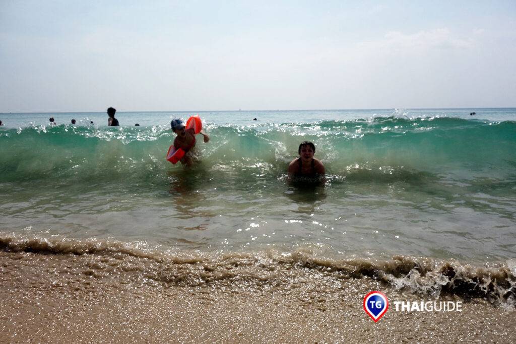Песок на Кароне кварцевый, светло-жёлтого цвета. Когда вы спускаетесь к морю, он скрипит под ногами, как снег, за это Карон называют “пляжем с поющим песком”. Вход в воду сперва плавный, а через 10-15 метров становится глубоко, поэтому отливы совсем незаметны. Купаться на Кароне понравится любителям длительных заплывов. Для семей с детьми Карон также подойдёт, хотя на Кате мелководья побольше.
